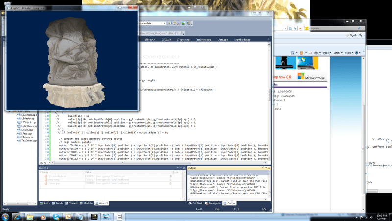 old screenshot of me working on hardware displacement mapping for Light Blade… I now know why developers are opting not to use it… unless you’ve tried implementing this yourself, you cannot imagine how HUGE of a headache it is – basically models must be specifically made for it to work well AND your code has to account for tons of discontinuities problems native to rendering polygonal meshes…